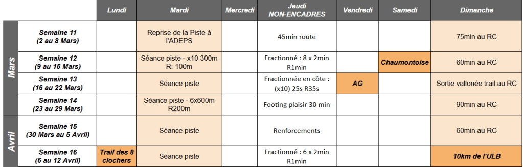 Les entraînements de la semaine sont pensés pour équilibrer progression et plaisir.